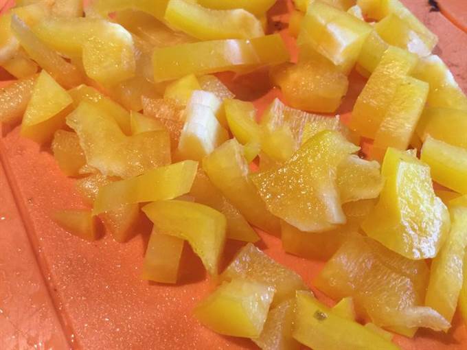 У болгарского перца удалите семена, нарежьте тонкими полосочками.