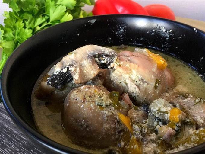 Размешайте в миске сливки и горчицу, и залейте этим курочку.