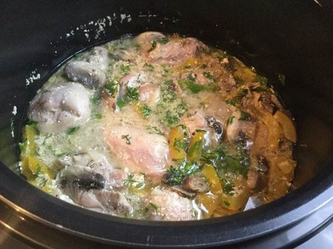 За 5 минут до готовности добавьте зелень, перемешайте, закройте мультиварку и готовьте до окончания программы.