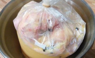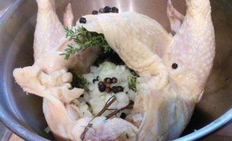 • Курицу промыть, обсушить. Установить «насест»: в миску поместить плотный полиэтиленовый пакет, в пакет положить курицу, залить апельсиновым соком, добавить 3 — 4 ст. л. соли и горошины перца. Не бойтесь добавить столько соли, курица возьмет столько, сколько ей нужно.