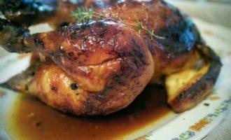 • Слить маринад, нафаршировать курицу луком и тимьяном. Закрепить зубочисткой отверстие и запекать курицу в заранее разогретой до 200°С духовке приблизительно 1,15 — 1,30 часа.