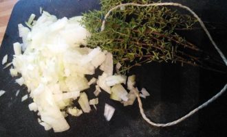 • Мелко нарезать луковицу, тимьян оставить на веточках, так его будет легче потом убрать.