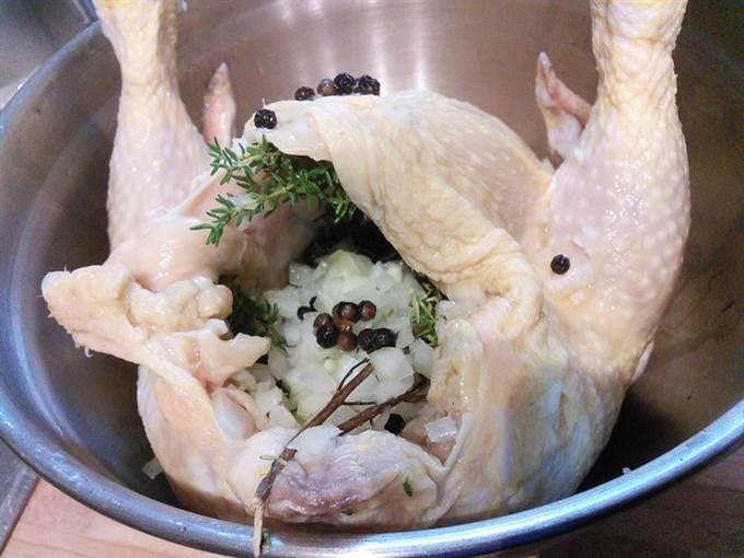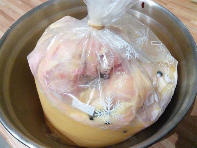• Курицу промыть, обсушить. Установить «насест»: в миску поместить плотный полиэтиленовый пакет, в пакет положить курицу, залить апельсиновым соком, добавить 3 — 4 ст. л. соли и горошины перца. Не бойтесь добавить столько соли, курица возьмет столько, сколько ей нужно.