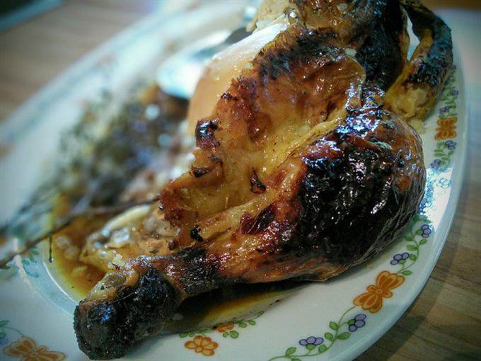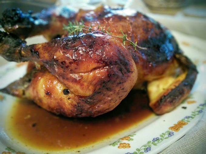 • Слить маринад, нафаршировать курицу луком и тимьяном. Закрепить зубочисткой отверстие и запекать курицу в заранее разогретой до 200°С духовке приблизительно 1,15 — 1,30 часа.