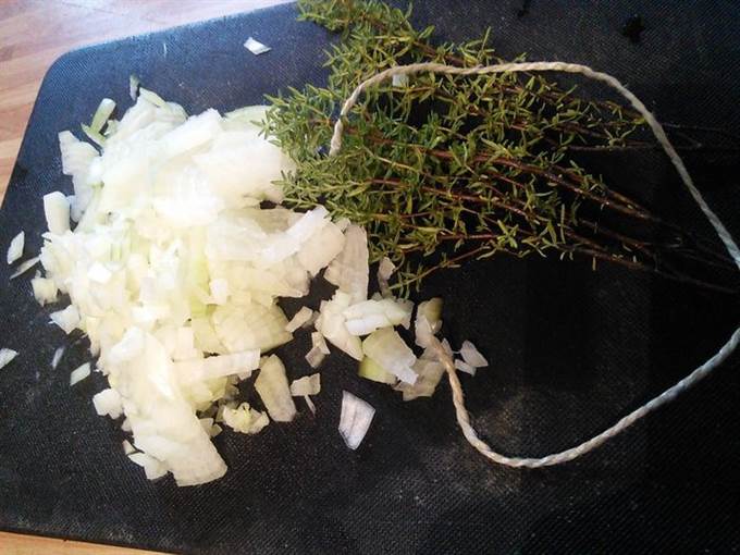 • Мелко нарезать луковицу, тимьян оставить на веточках, так его будет легче потом убрать.