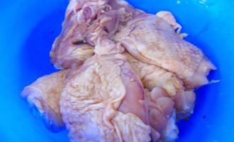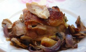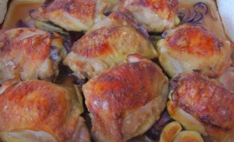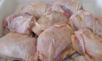 Куриные бедра намажьте бальзамиком и слегка полейте вином (100 мл) и оставьте на 1 час.