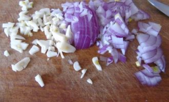 Еще дополнительно 2 зуб чеснока и оставшуюся луковицу мелко измельчите.