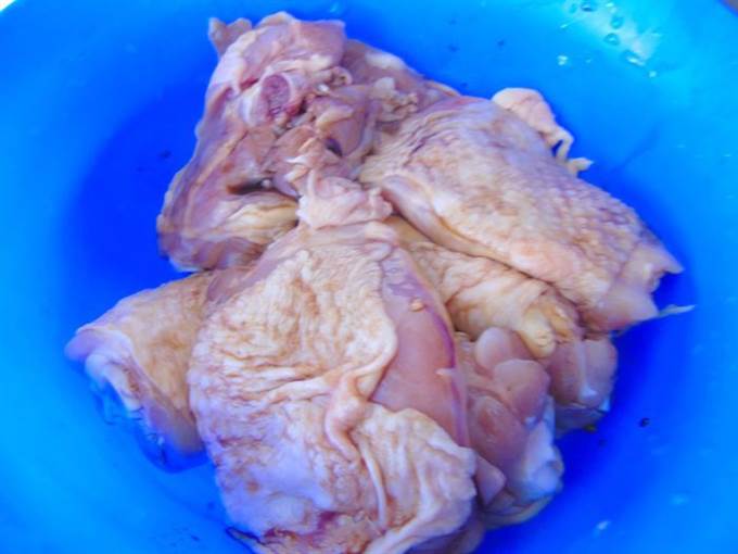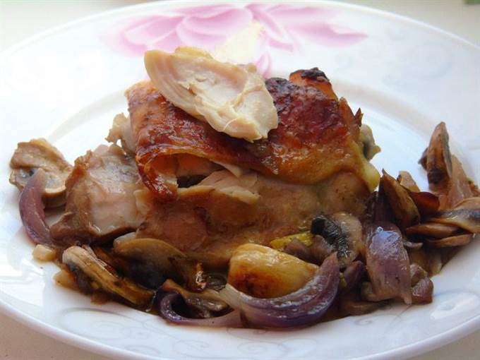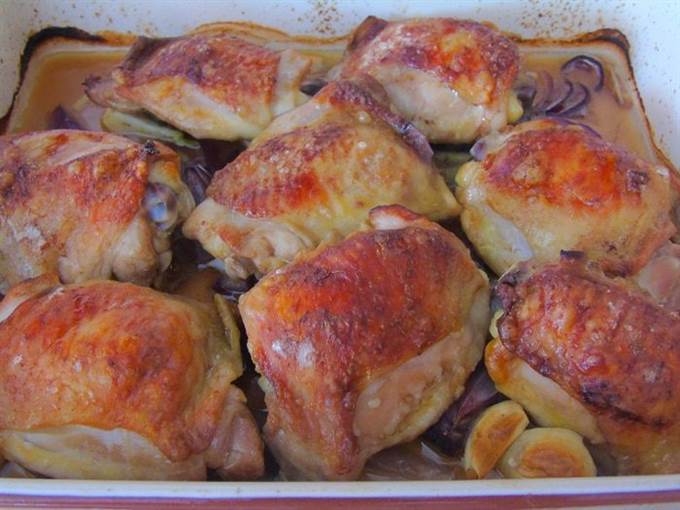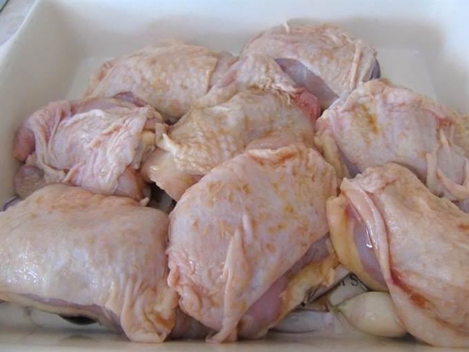 Куриные бедра намажьте бальзамиком и слегка полейте вином (100 мл) и оставьте на 1 час.