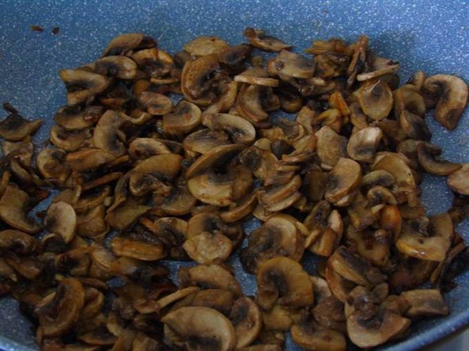 Обжарьте вместе с нарезанными грибами до золотистости.