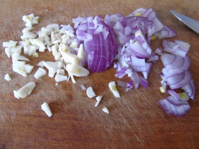 Еще дополнительно 2 зуб чеснока и оставшуюся луковицу мелко измельчите.