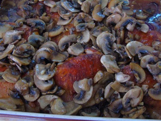 Всыпаем грибную смесь и заливаем оставшимся вином, отправляем опять в духовку на минут 20.