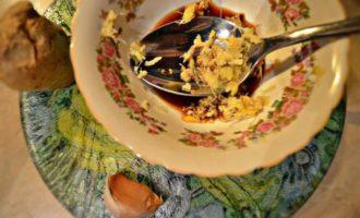 Корень имбиря (1 — 1,5 см) очистить и натереть на мелкой терке. Соединить имбирь с измельченным чесноком и 1 ст л соевого соуса, добавить 1 ст л коньяка, паприку и перец по вкусу.