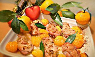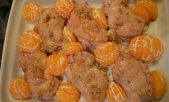 В форму для выпекания выложить куриное филе вместе с мандаринами и залить оставшимся маринадом. Поставить на 15 — 20 мин запекаться в разогретую до 180г духовку.