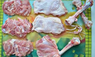 Отделить с помощью острого ножа от мяса кость, удалить сухожилия. Для праздничного застолья гораздо удобнее использовать мясо без костей. Куриное филе посолить и оставить на 30 мин.
