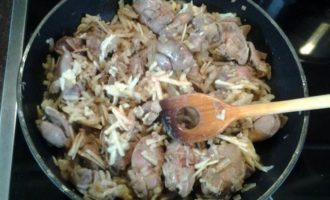 К печени добавить очищенное и натёртое на крупной тёрке яблоко. Перемешать и тушить 3 — 4 минуты.