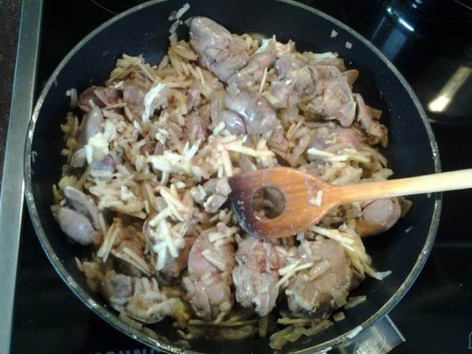 К печени добавить очищенное и натёртое на крупной тёрке яблоко. Перемешать и тушить 3 — 4 минуты.
