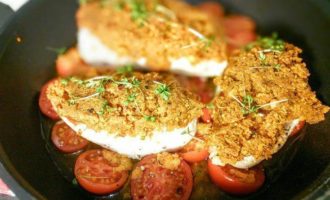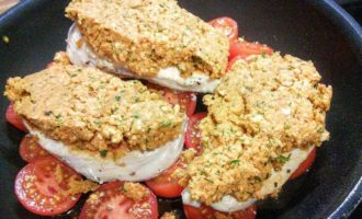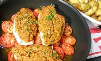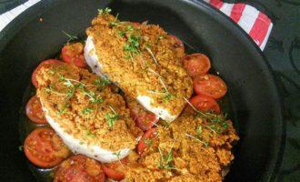 Покрыть мясо щедрым слоем ароматной сухарной смеси.