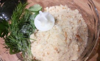 Всыпать сухарную крошку и измельчить, не слишком мелко.