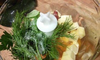 Для корочки поместить в блендер холодное масло, желток, томат, зелень, соль, перец и лимонный сок.