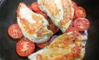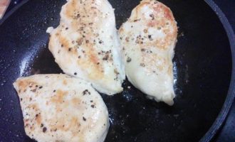Куриное филе обмыть, просушить и обжарить на разогретом масле с обеих сторон до золотистой корочки, снять с огня, посолить и поперчить.