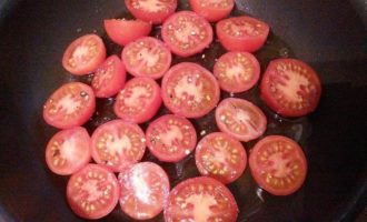 Помидоры черри или просто мелкие помидорки разрезать на половинки, уложить в форму для запекания, полить оливковым маслом, посолить и поперчить. Включить духовку на разогрев до 175°С.