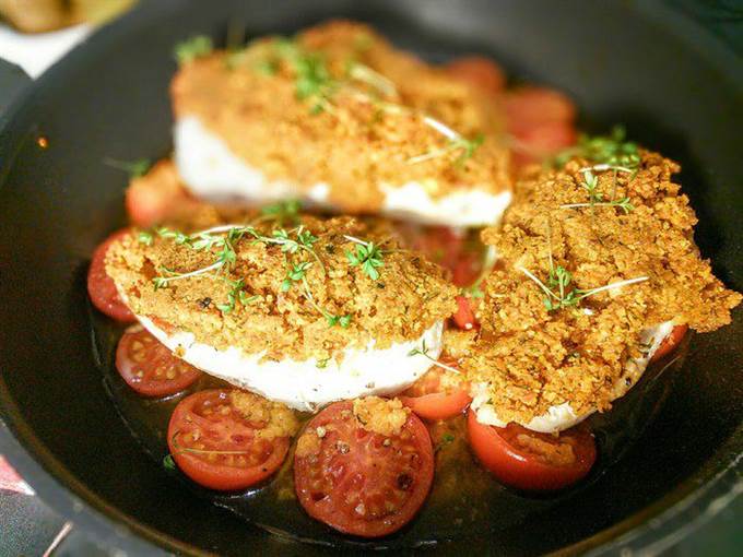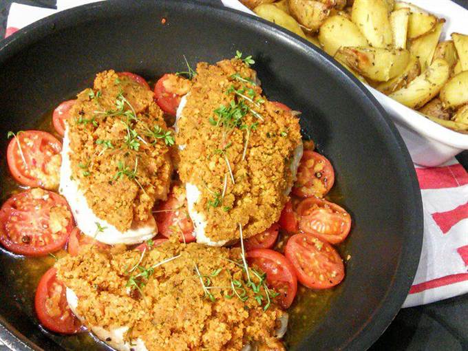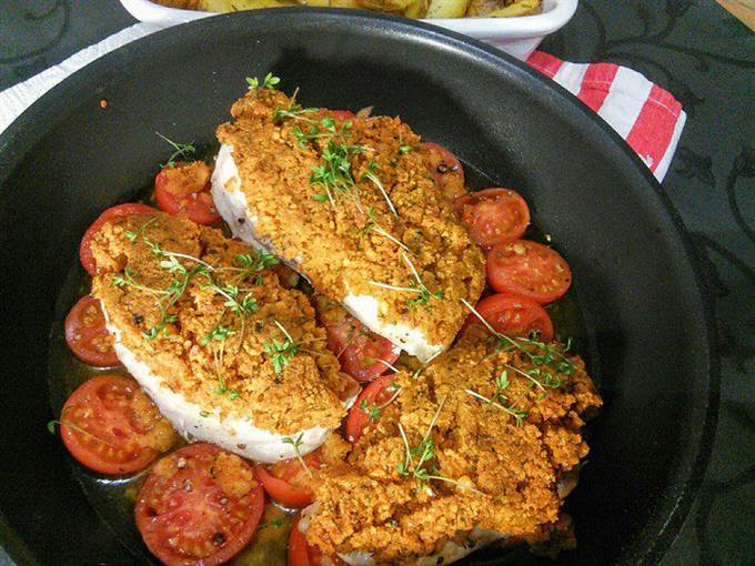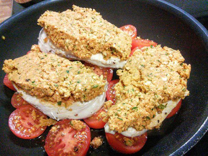 Покрыть мясо щедрым слоем ароматной сухарной смеси.