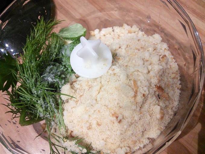 Всыпать сухарную крошку и измельчить, не слишком мелко.