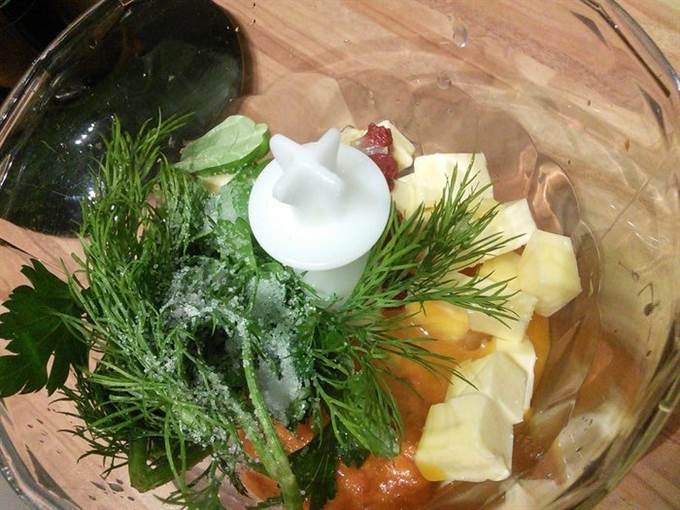 Для корочки поместить в блендер холодное масло, желток, томат, зелень, соль, перец и лимонный сок.
