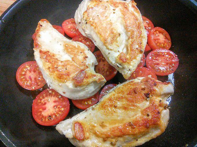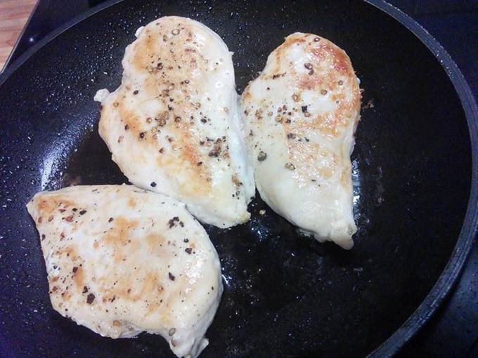 Куриное филе обмыть, просушить и обжарить на разогретом масле с обеих сторон до золотистой корочки, снять с огня, посолить и поперчить.