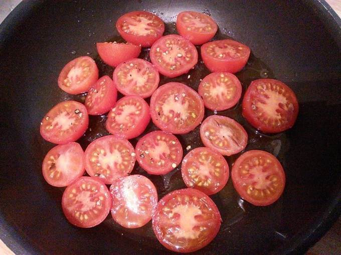 Помидоры черри или просто мелкие помидорки разрезать на половинки, уложить в форму для запекания, полить оливковым маслом, посолить и поперчить. Включить духовку на разогрев до 175°С.