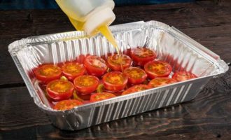 Помидоры черри разрезать на половинки, уложить в форму для запекания, полить оливковым маслом, добавить специи.