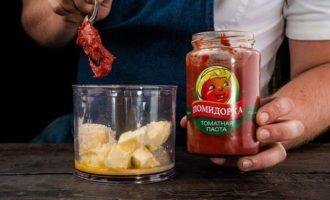 Положить в блендер холодное сливочное масло, желток, томатную пасту «Помидорка», зелень, соль, перец и лимонный сок. Всыпать сухарную крошку и все измельчить.