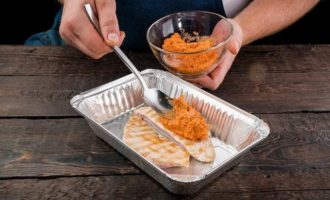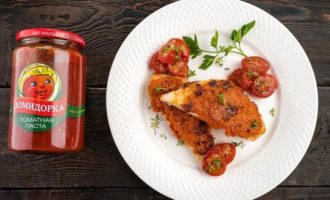Уже обжаренное куриное филе выложить на противень, в котором будет запекаться блюдо. Сверху посыпать сухарной крошкой. Запекать 15 минут.