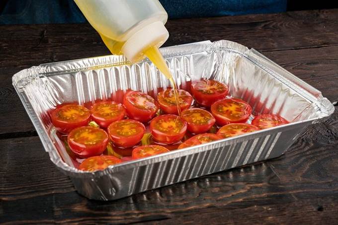 Помидоры черри разрезать на половинки, уложить в форму для запекания, полить оливковым маслом, добавить специи.