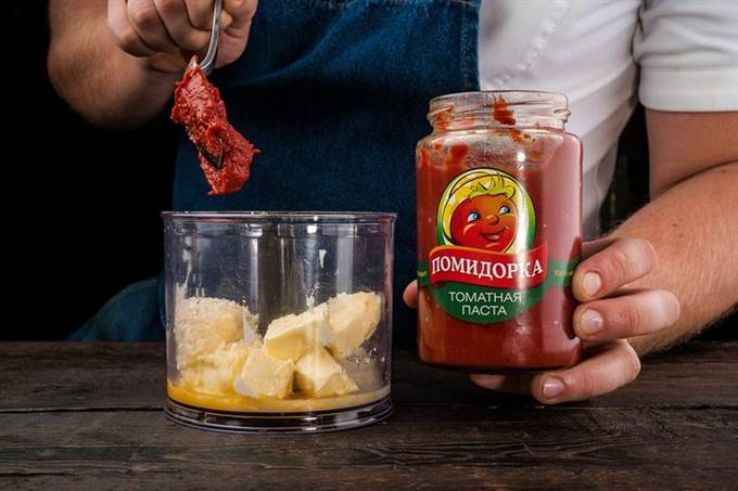 Положить в блендер холодное сливочное масло, желток, томатную пасту «Помидорка», зелень, соль, перец и лимонный сок. Всыпать сухарную крошку и все измельчить.