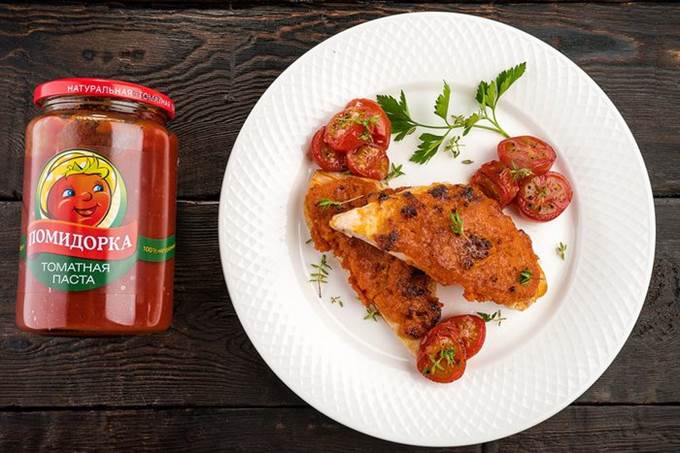 Уже обжаренное куриное филе выложить на противень, в котором будет запекаться блюдо. Сверху посыпать сухарной крошкой. Запекать 15 минут.