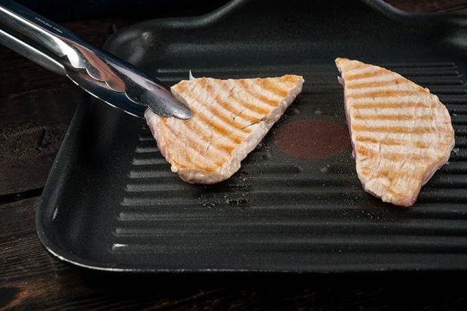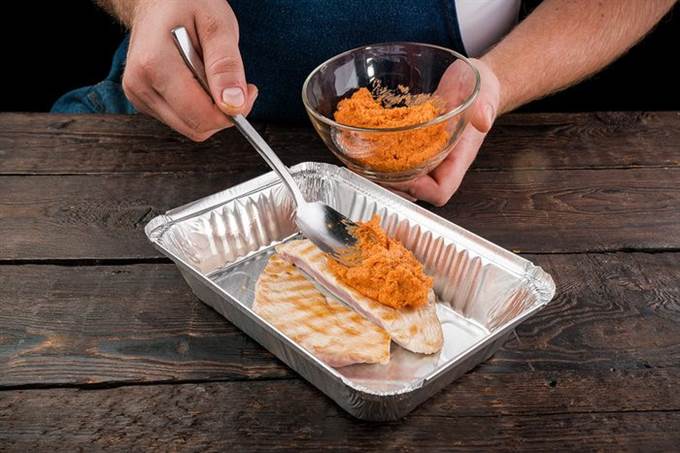 Куриное филе обжарить с обеих сторон на оливковом масле, посолить и поперчить.
