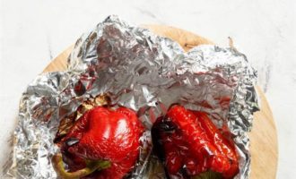 Подготовить соус: 2 болгарских перца обжарить на гриле до черных подпалин. Готовые перцы положить в пакет, завязать и оставить на несколько минут.