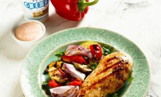 Красный лук, кабачки и болгарский перец нарезать. Достать из холодильника курицу. Выложить курицу и подготовленные овощи на гриль, обжарить до готовности.