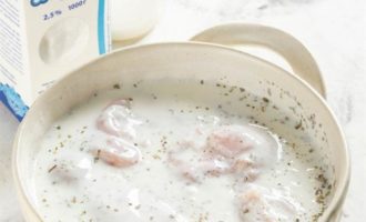 Куриное филе положить в миску. Добавить кефир, майоран, соль и перец. Хорошо перемешать, накрыть пленкой и убрать в холодильник на несколько часов.