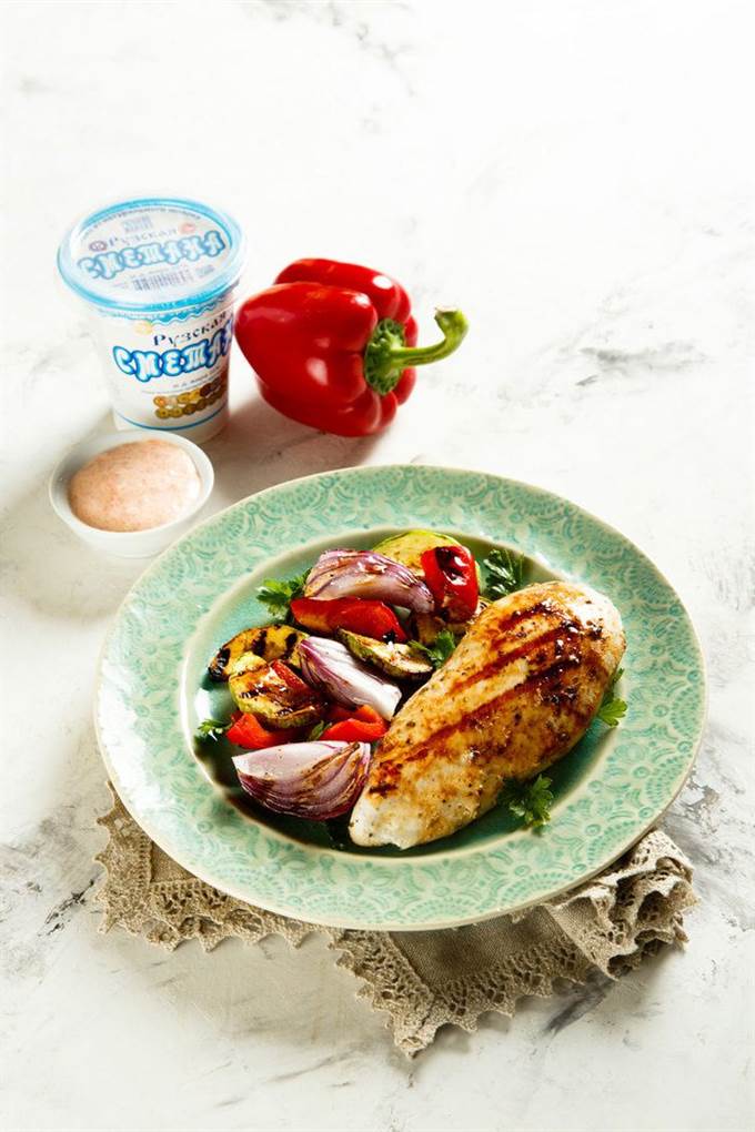 Красный лук, кабачки и болгарский перец нарезать. Достать из холодильника курицу. Выложить курицу и подготовленные овощи на гриль, обжарить до готовности.