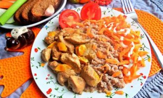 Также предлагаем к блюду свежие помидоры. Угощаемся пикантной, но очень нежной по структуре курочкой!