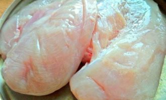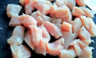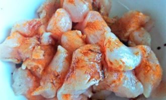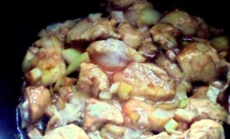 В мультиварку налить оливковое масло, выложить замаринованную курицу и включить режим «жарка» на 5 минут с закрытой крышкой, потом 5 минут с открытой.