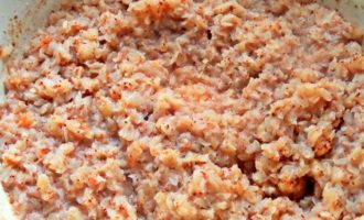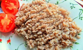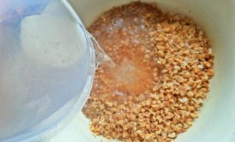 На гарнир отвариваем гречку или для быстроты покажу подачу с гречневыми хлопьями. На порцию достаточно 70 г хлопьев. Заливаем их горячей водой (200 мл).