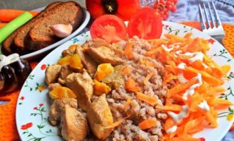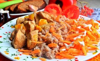 Рядом выкладываем курочку, по желанию поливаем соусом.