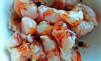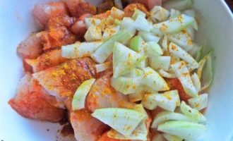 Всыпать порубленный лук. Обвалять в маринаде и оставить минут на 15 — 20.