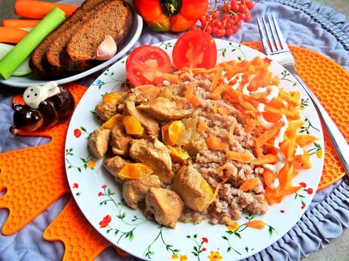 Также предлагаем к блюду свежие помидоры. Угощаемся пикантной, но очень нежной по структуре курочкой!