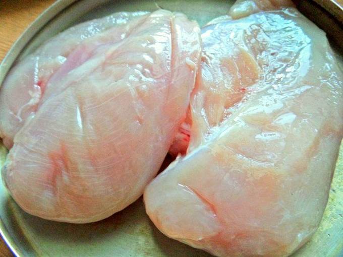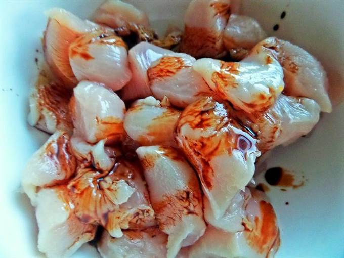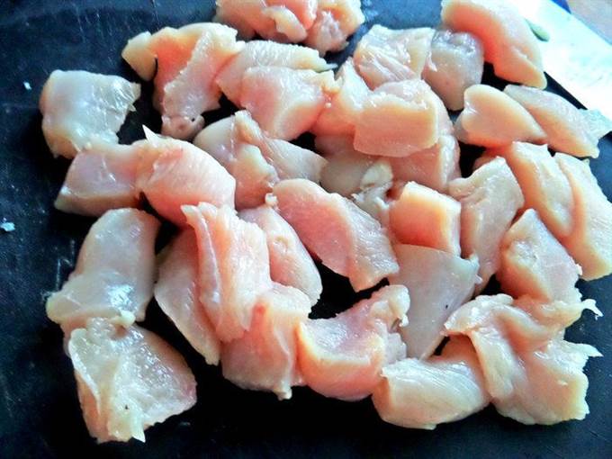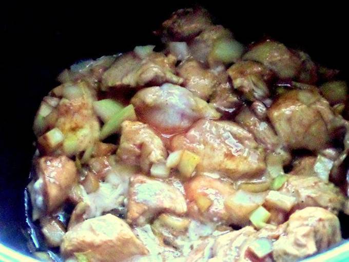 В мультиварку налить оливковое масло, выложить замаринованную курицу и включить режим «жарка» на 5 минут с закрытой крышкой, потом 5 минут с открытой.