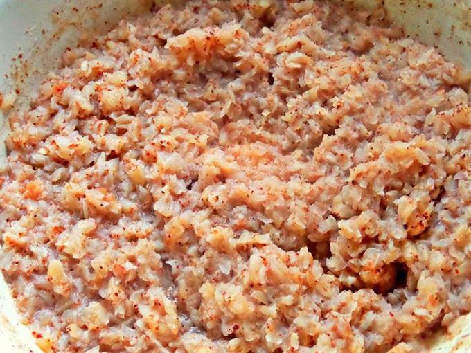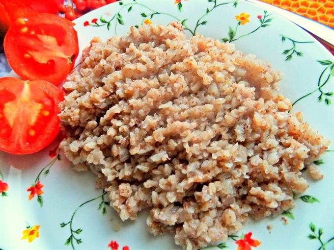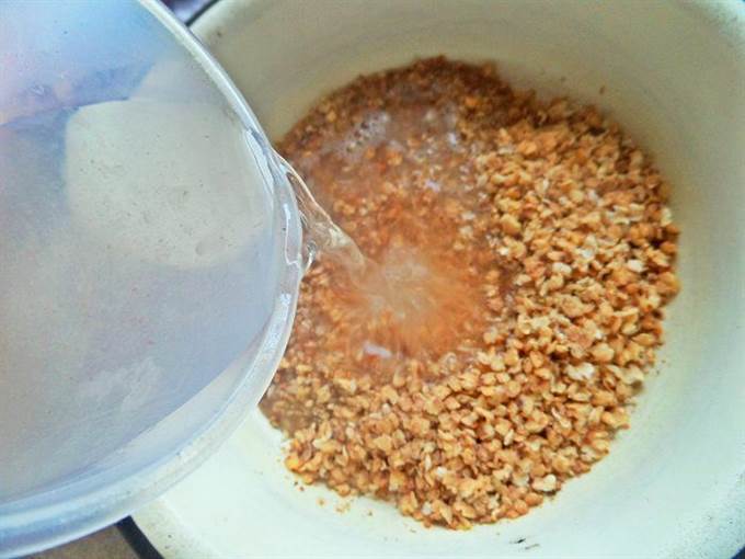 На гарнир отвариваем гречку или для быстроты покажу подачу с гречневыми хлопьями. На порцию достаточно 70 г хлопьев. Заливаем их горячей водой (200 мл).