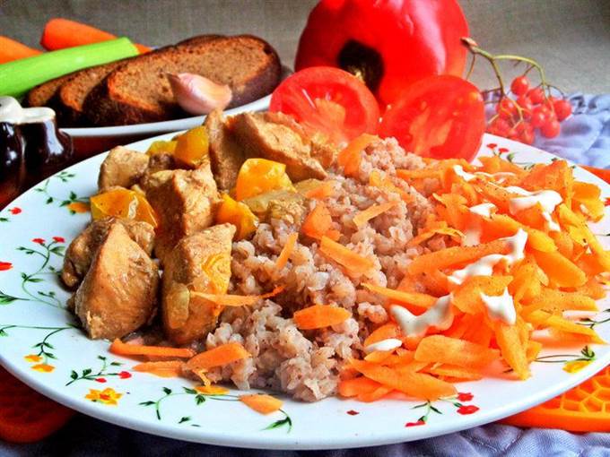 Рядом выкладываем курочку, по желанию поливаем соусом.